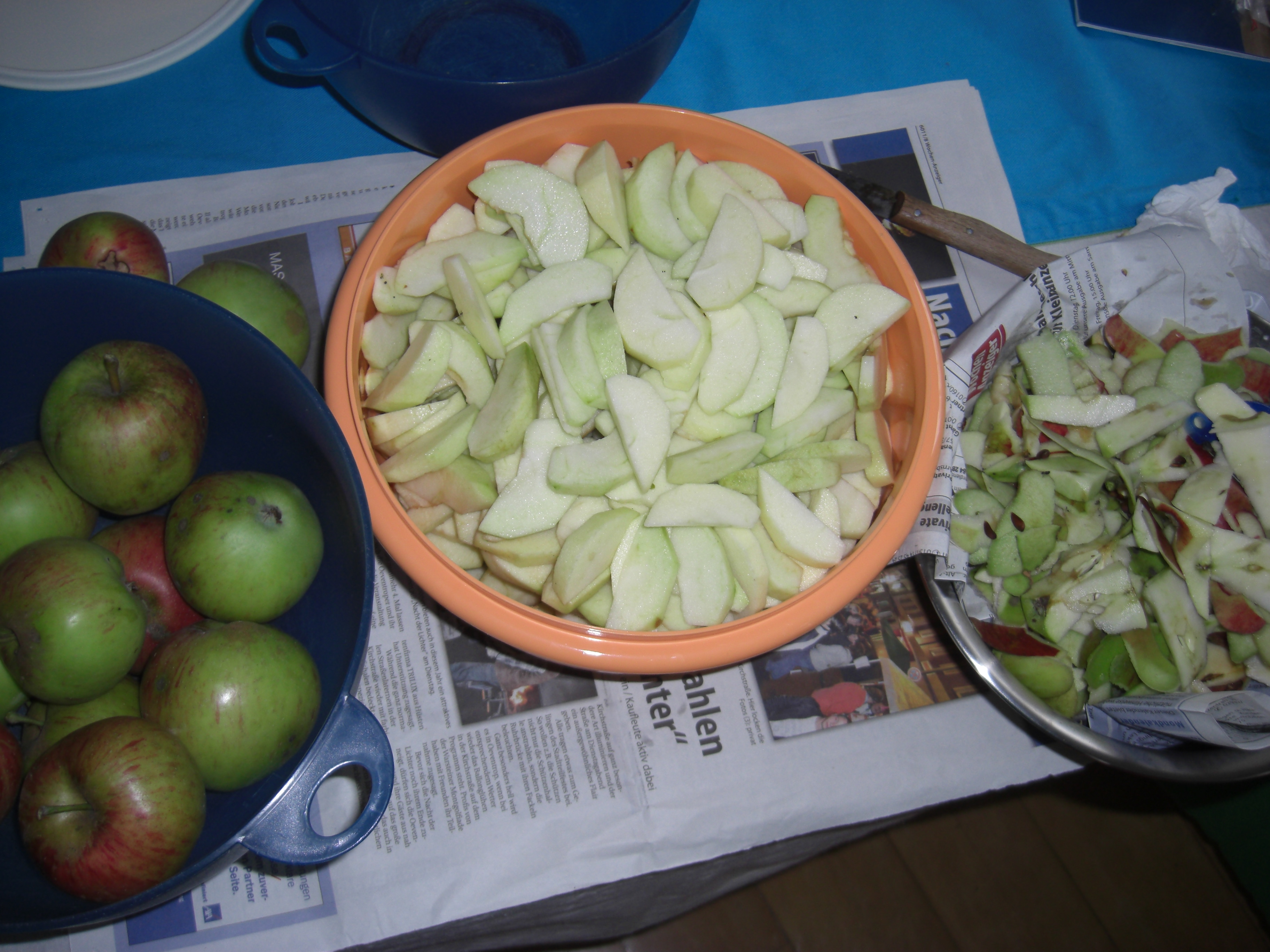 Die Äpfel sind reif! Also ab in den Garten, eine Schüssel voll pflücken, schälen, entkernen und in Spalten schneiden. 150 g Butter oder Margarine schaumig schlagen und 150 g Zucker und 1 Päckchen Vanillinzucker unterrühren. 2 Eier und eine Prise Salz zugeben. 500 g Weizenmehl mit 1 Päckchen Backpulver mischen und nach und nach zugeben. 1/8 – 1/4 l Milch zugeben, bis der Teig schwer (reißend) vom Löffel fällt. Ein Backblech einfetten und mit Backpapier belegen. Den Teig auf dem Blech verteilen und die Apfelspalten schön ordentlich gleichmäßig, Reihe für Reihe, auf den Teig geben. Äpfel leicht andrücken und den Kuchen bei starker Hitze ca. 40 Minuten backen. Sobald der Kuchen aus dem Ofen geholt wurde, kann er mit Zucker & Zimt bestreut werden.