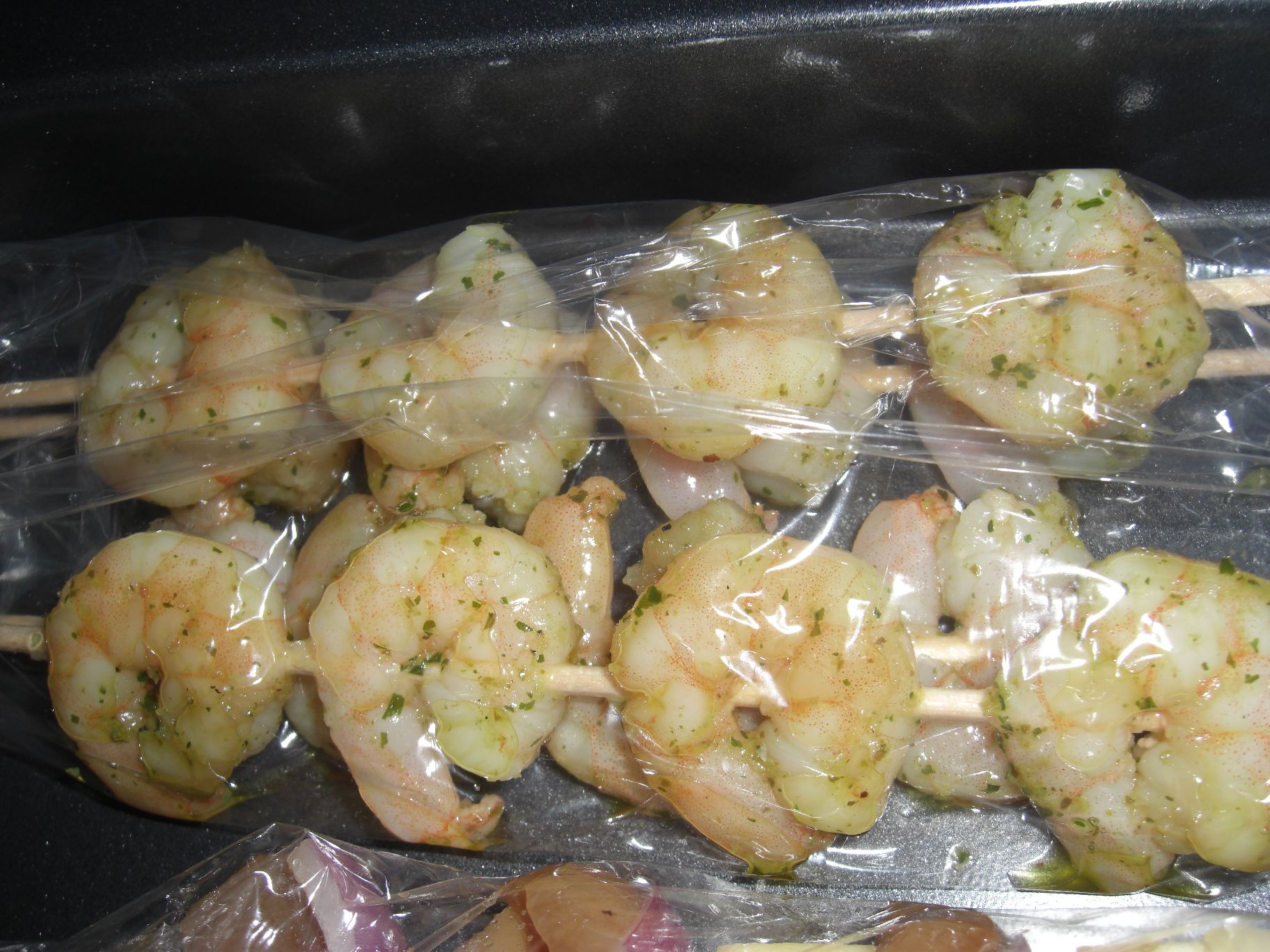 Für die Marinade 1 EL Bärlauch-Paste oder 30 g frisch gehackten Bärlauch mit 1 EL Olivenöl und 1 EL Whisky oder Weinbrand verrühren. 12 große Garnelen waschen und trocken tupfen und mindestens eine Stunde in der Marinade einlegen.