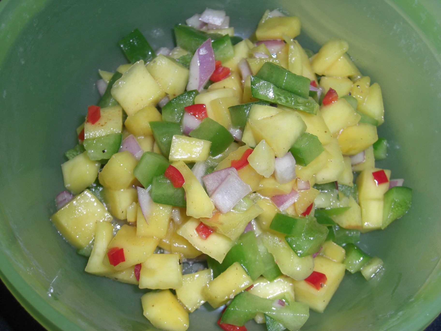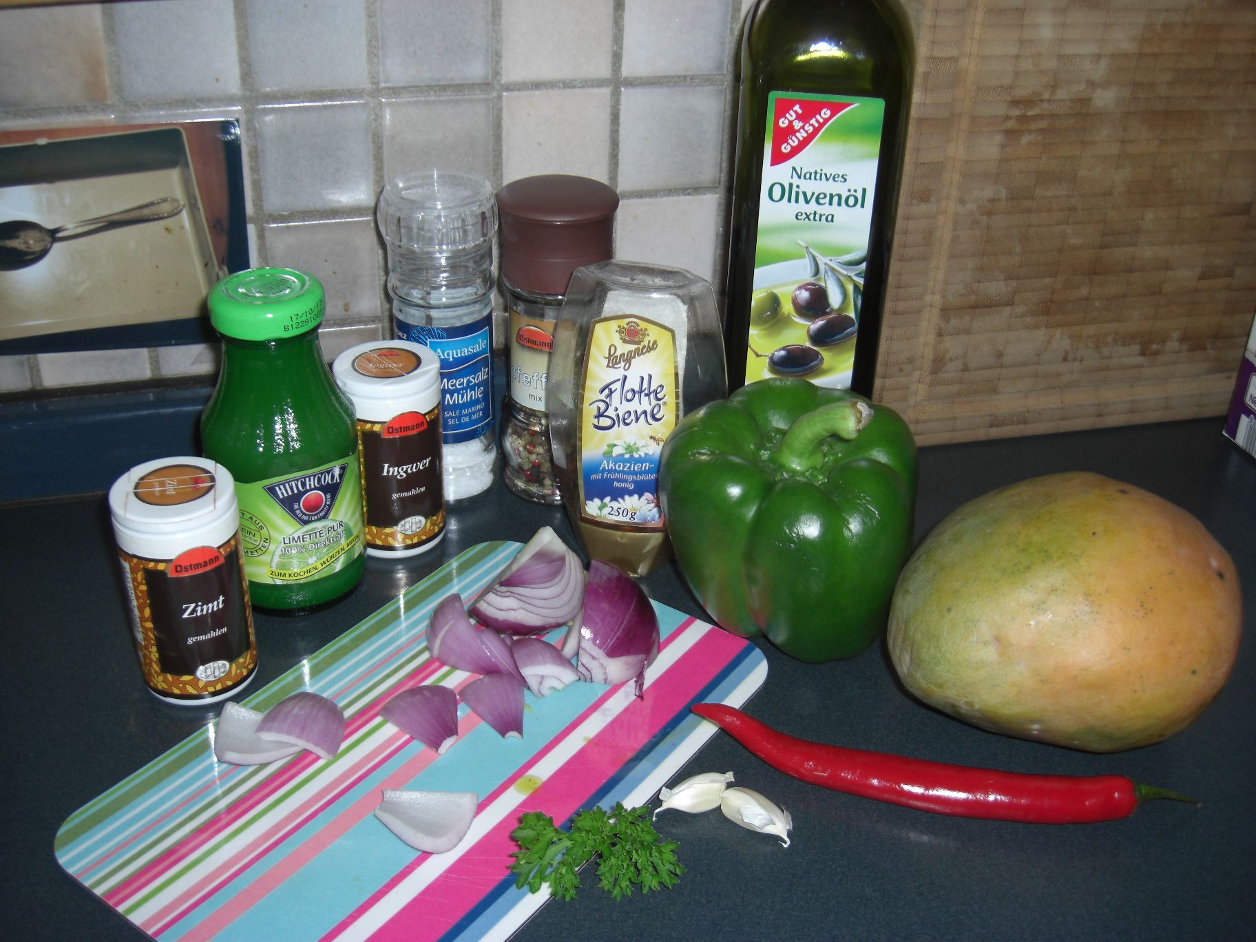 Eine Mango, eine grüne Paprikaschote, eine rote Zwiebel und die eine rote Chilischote putzen und in kleine Stückchen schneiden. 2 EL Zitronen- oder Limettensaft, 1 EL Olivenöl und 1 TL Honig sowie eine mit Salz zu Mus geriebene Knoblauchzehe und 1 EL geriebenen Ingwer mit den Obst- und Gemüsestückchen in einer Schüssel mischen und mit einer Prise Zimt, Salz und Pfeffer pikant abschmecken.